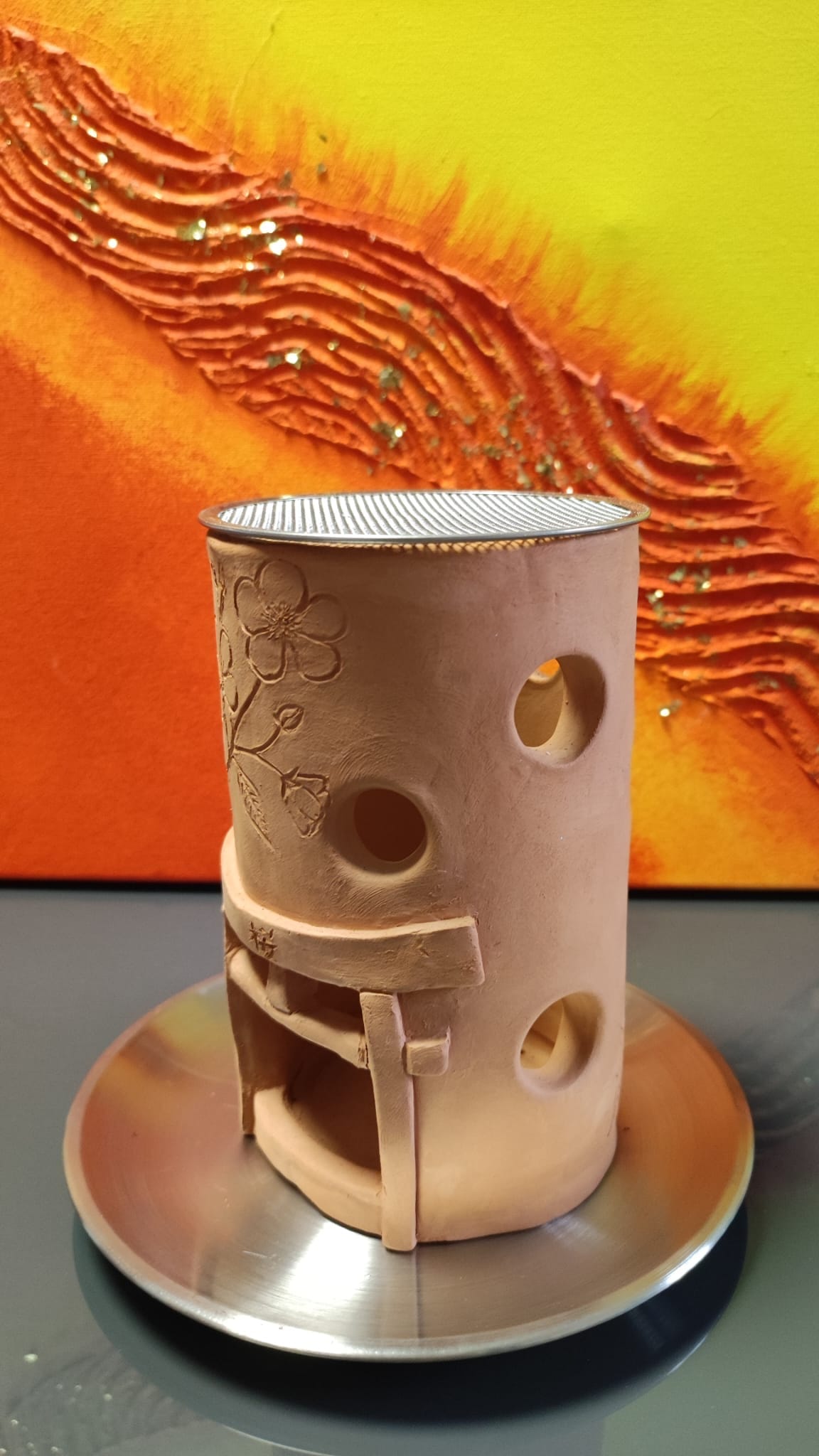 Jeder Räucherofen/Räucherstövchen ist aus lufttrocknendem Ton und individuell verziert – ein Unikat – kein Stövchen gleicht dem anderen.